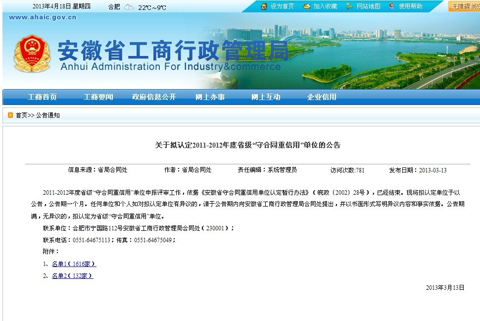 以下為安徽省工商行政管理局網站的公告信息: