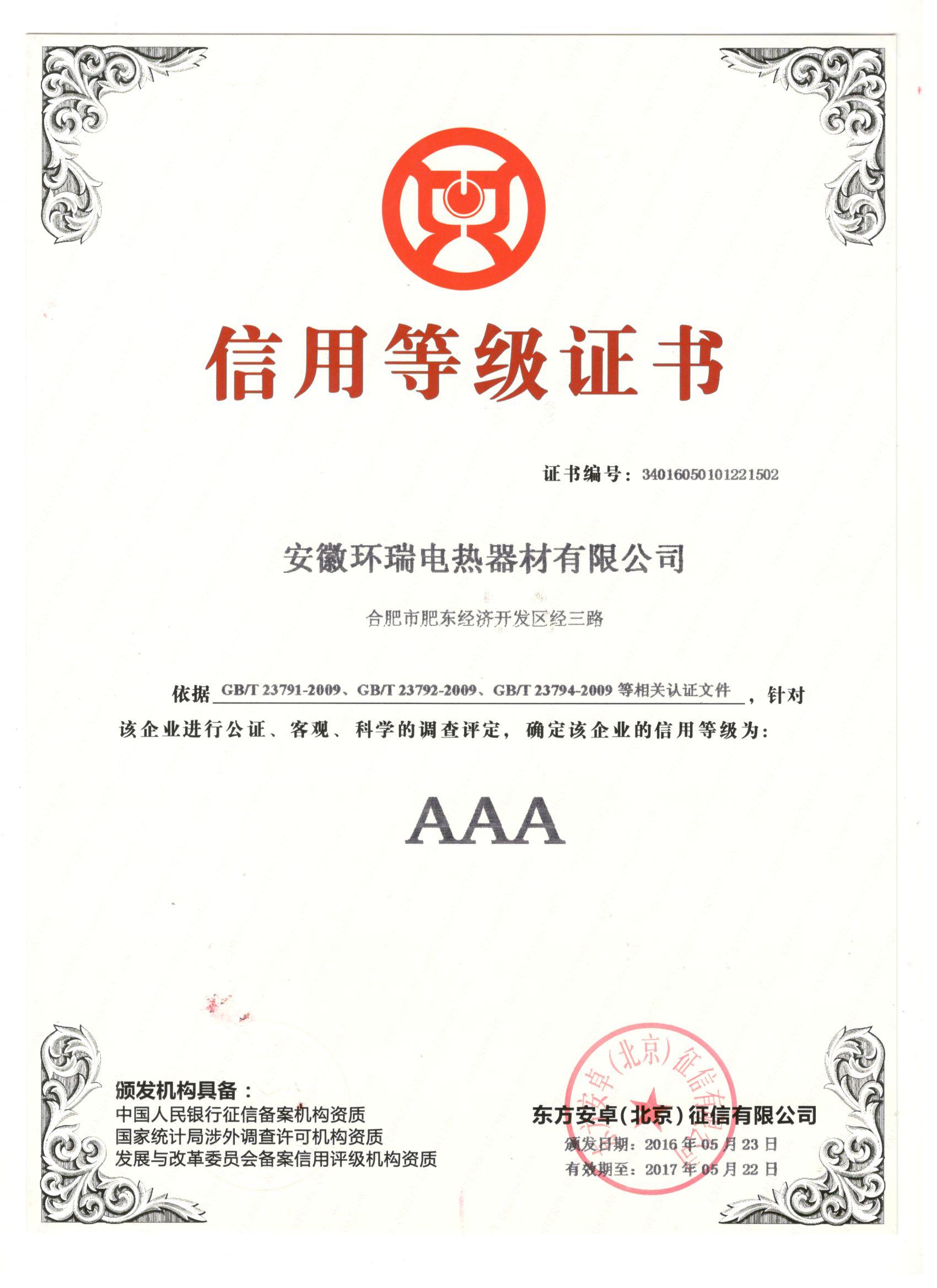 誠信是中華民族的傳統(tǒng)美德,誠信是一個企業(yè)立命之根,誠信是一個企業(yè)發(fā)展之本。“AAA”作為一個誠信的標志,是對企業(yè)基本信息、綜合指標、經(jīng)營發(fā)展、信用記錄等各個方面行為全方位的評價,熱烈慶祝安徽環(huán)瑞電熱器材有限公司榮獲 “企業(yè)AAA級信用等級證書”。