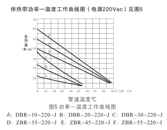 確定和選擇電熱帶的輸出功率,不是以標稱功率為依據,而是一系統維持溫度時電熱帶必須輸出的功率為依據。所選的電熱帶的功率,即使在最惡劣的條件下(如最低氣溫,最大風度),應仍能補償設備和管道的熱損失,使維持溫度不致降低。根據計算的得出的管道每米熱損失值在功率-溫度曲線上查出管道維持溫度時電熱帶的功率,以確定合適的電熱帶規格。