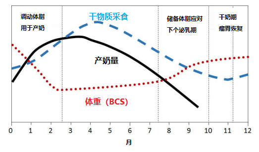 奶牛體況評分BCS這一個指標(biāo)可以同時反映奶牛的產(chǎn)奶量、體重和干物質(zhì)采食,其關(guān)系見下圖。